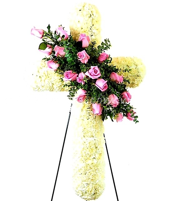 All white carnation wreath with pink roses and Sineria. Can be used as a casket spray.