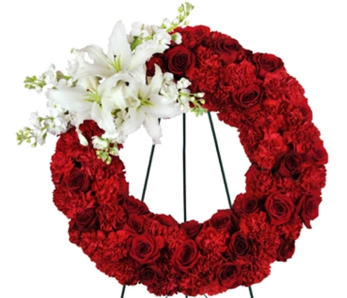 Heart felt memories symbolised with this red standard carnations, red roses, white lilies and white Mathiola wreath.