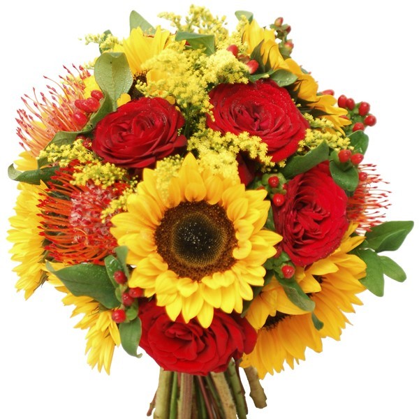 Sunflowers, Pin Cushion, Solidago and Red Roses Handtied bouquet.