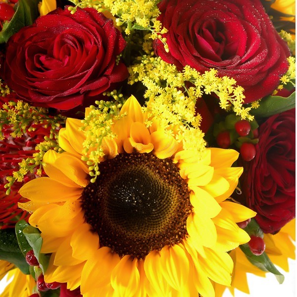 Sunflowers, Pin Cushion, Solidago and Roses Bouquet
