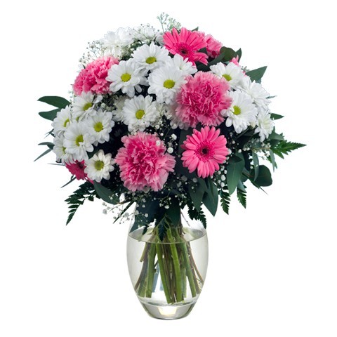 Pink Carnations, Pink Gerberas, Gyps, White Chrysanthemums and Greens. Vase included.