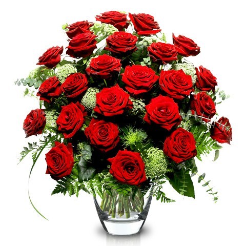 Luxury Red Roses, Lace, Greens. Presented in a glass vase.