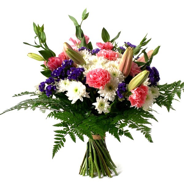 Pink standard, Statice, Lusianthus and Leather Leaves Handtied to Please