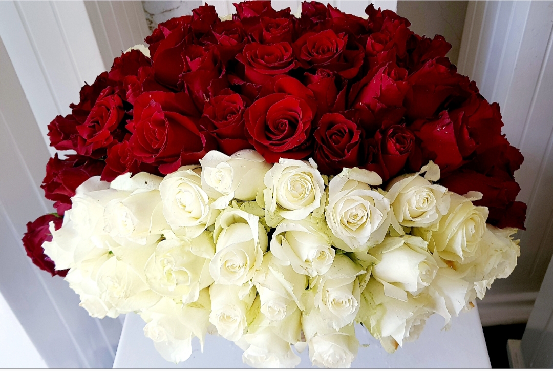 Fifty carefully selected red roses accompanied by fifty white roses arranged on each side. Perfect for the one and only or for that one significant moment.