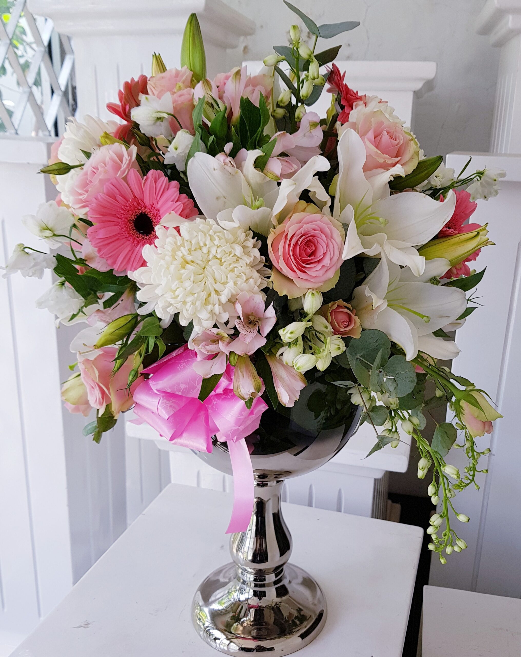 A simply luxury arrangement. Pink and white flowers. Glass vase may vary.